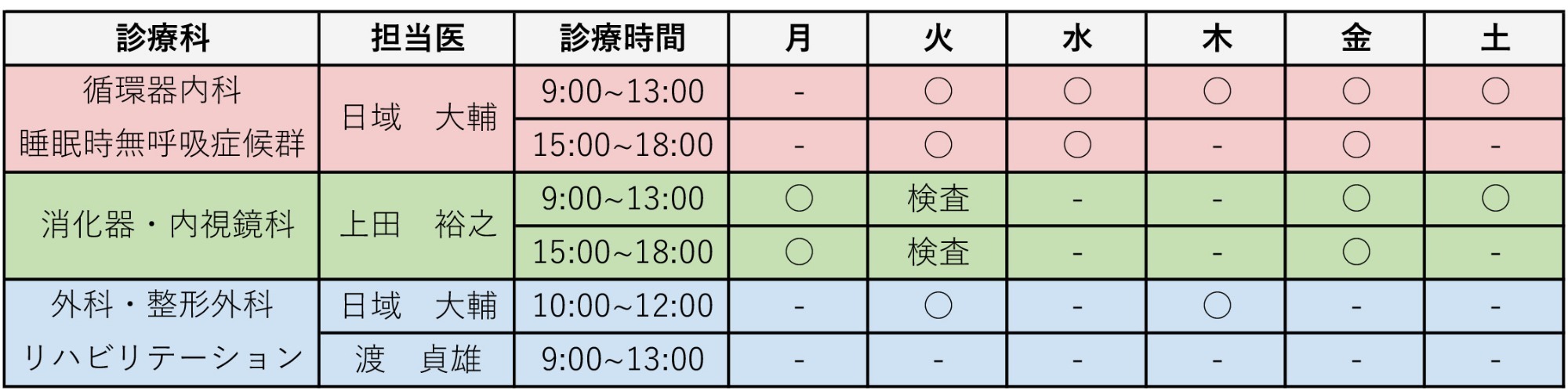 | 診療科目 | 内科・循環器内科・消化器内科・内視鏡内科・外科・整形外科・肛門外科・リハビリテーション科 |
